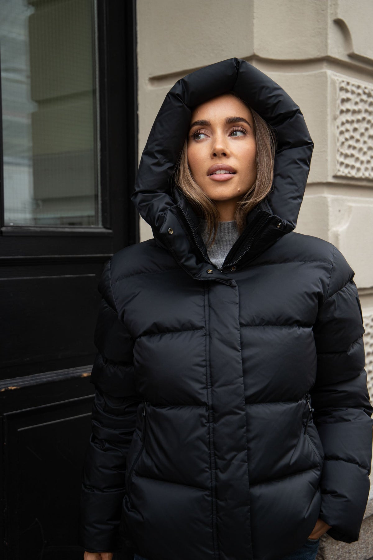 En tidløs, svart dunjakke som kombinerer komfort med et rent og klassisk uttrykk.