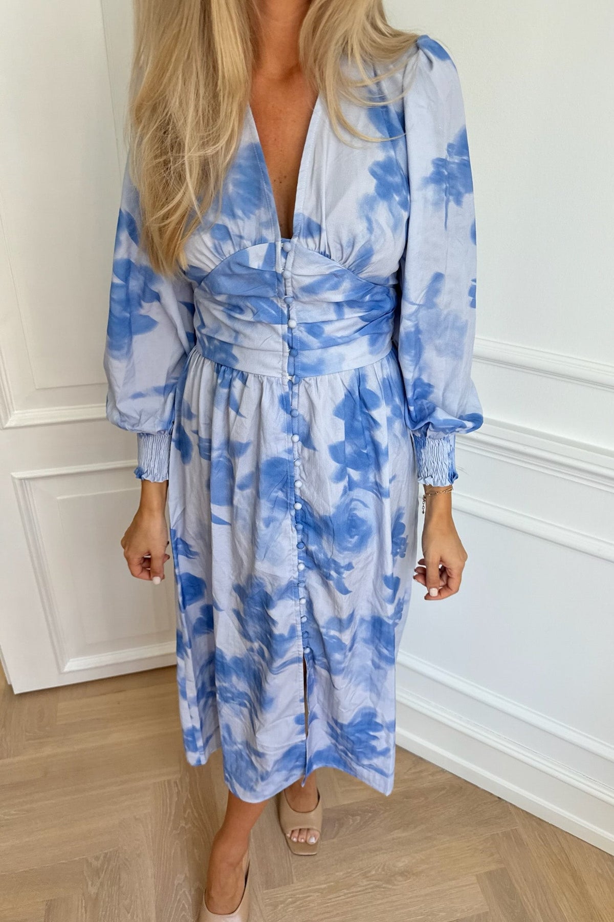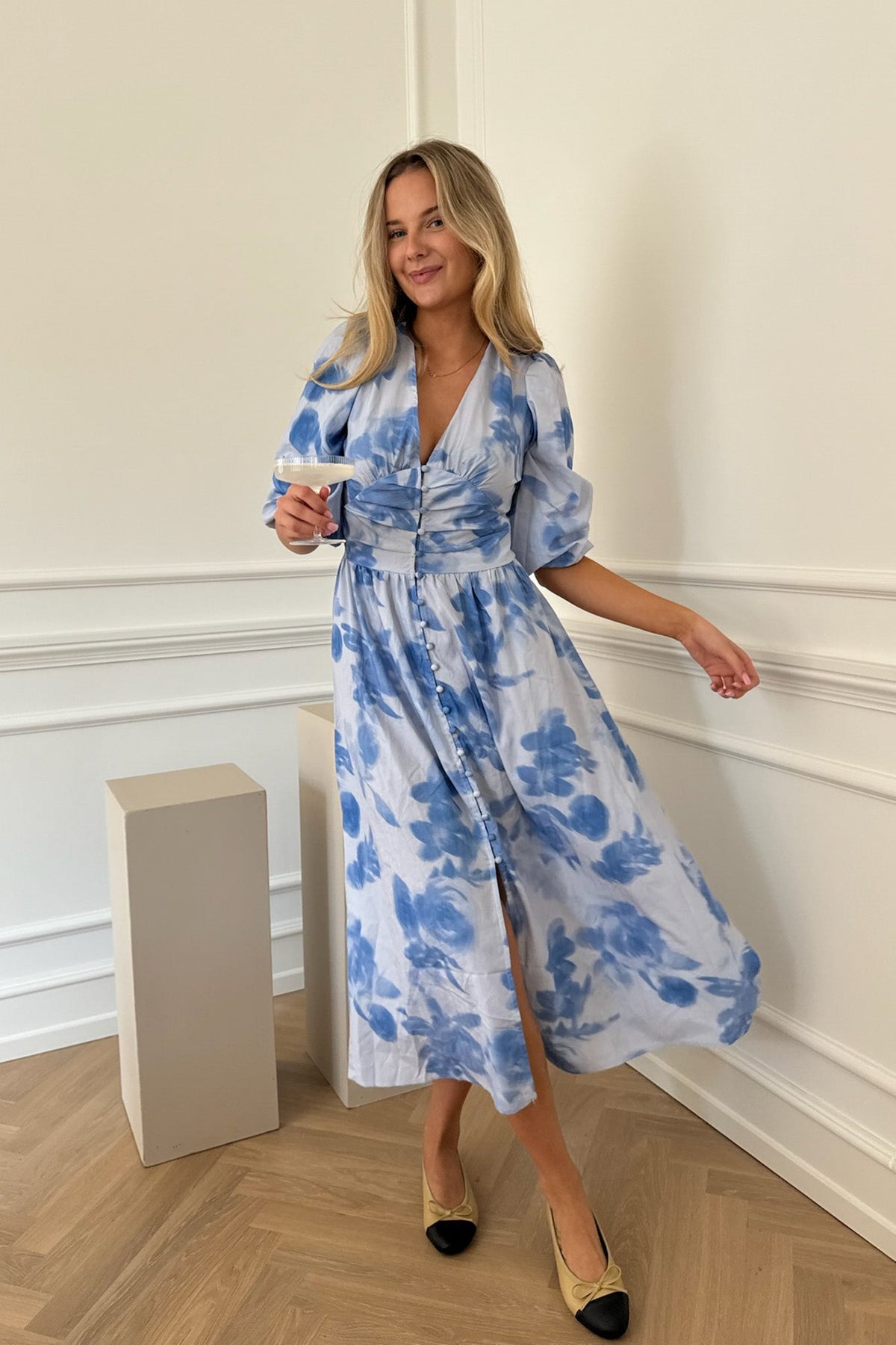 Adel Lang Kjole – Abstrakt Blå Blomsterprint