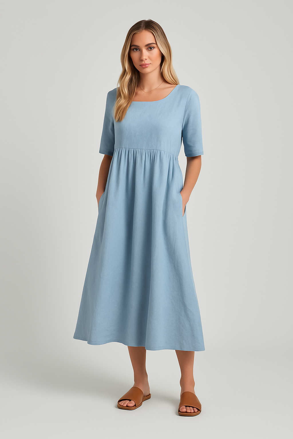 Opplev frihetsfølelsen med Sofia™ – flatterende bomullskjole. Den myke A-linjen skjærer lett under bysten og faller løst over magen, slik at du føler deg komfortabel hele dagen – selv når du trenger litt ekstra luft og plass. Et ideelt følge til både avslappede dager og små ærender, der komfort og selvtillit går hånd i hånd.
